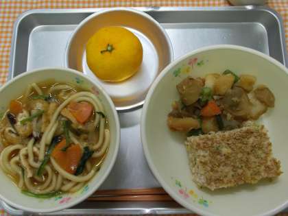 ♪ごもくうどん 松風焼き 野菜のうまに くだもの(みかん) 牛乳♪
