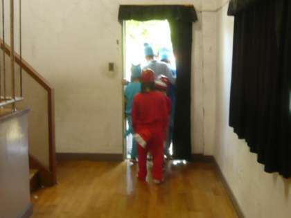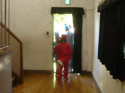 子供たちは、体育館の舞台裏にあるドアから退場します。