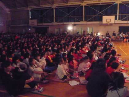 劇が始まる前の体育館は、子供たちのささやき声が聞こえます。