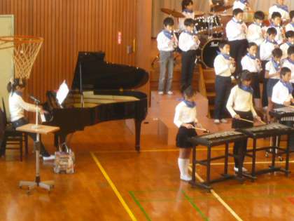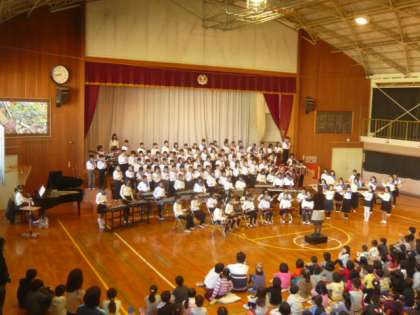 全校児童が、5年生の演奏に耳を傾け、じっと聞き入っています。