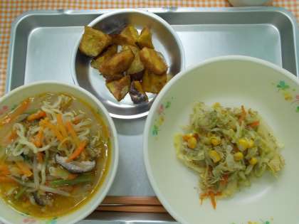 味噌ラーメンにトウバンジャンをいれて作りました。久しぶりのラーメンで、体があたたまりおいしかったです。安倍川いもは、一度さつまいもをからあげにしてから、みつをからませ、きなこをまぶして作りました。口がもそもそしないで食べられました。