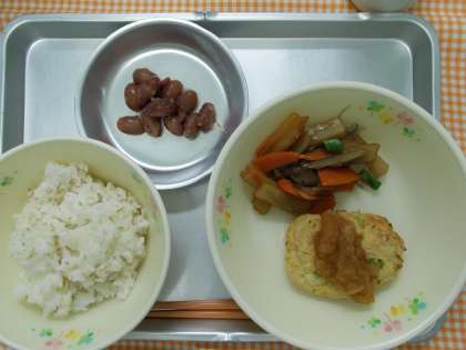 久しぶりのハンバーグのような気がします。大根おろしをソースのように作り、ハンバーグの上にかけて食べます。野菜のいりには、野菜がちぎれることもなく、きれいに仕上がりました。きょうの給食はみんなよくたべていました。