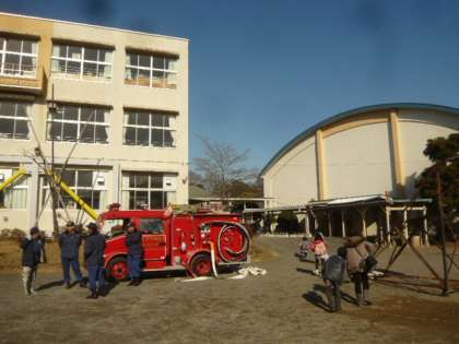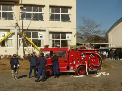 校庭には、消防自動車の姿も見えます。