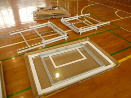 体育館の床には、真新しいバスケットゴールが置かれています。