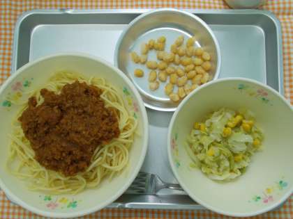 子どもたちの大好きなミートソースです。朝早くから玉ねぎをどろどろになるまでいためて作ります。給食室から、玉ねぎの香りが1階の廊下中に匂っていました。全部で69キログラムの玉ねぎを使いました。ポップビーンズは、大豆をゆでて、でんぷんをからめて油であげたものに、塩をふりいれた簡単にできるものです。ゆでるのが大変なら、ゆで大豆を使っても作れます。ご家庭でもぜひ作ってみてください。