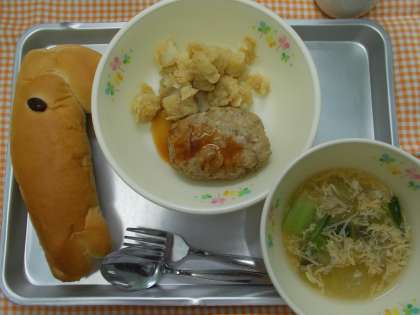 ♪今年の干支(うま)型のパン ごぼうハンバーグ じゃがいものバターに 青梗菜ときのこのスープ 牛乳♪
