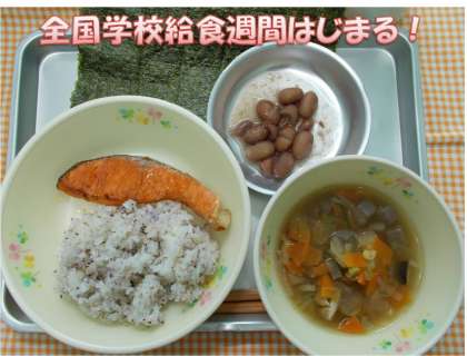 きょうから、全国学校給食週間がはじまりました。30日までです。始まりは山形県で、きょうのような、おにぎり・鮭の焼き魚・味噌汁・漬物でした。昔なつかしい献立もでてきます。