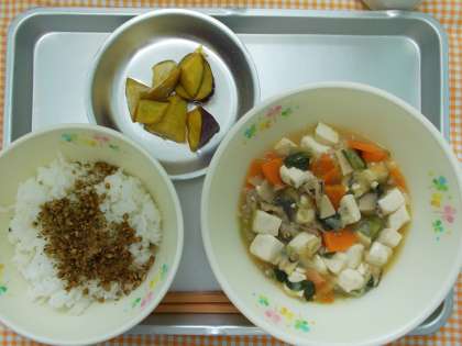 ♪ごはん アーモンドふりかけ 豆腐のうまに キャンディーポテト 牛乳♪