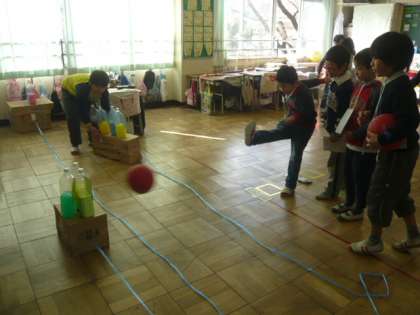 上手にボールを蹴ると、ペットボトルが倒れます。