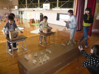 6年「箱の横をたたいて、前に立ててある紙を倒します!」