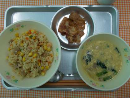 ♪チャーハン とりにくのバンバンジー焼き たまごとコーンの中華スープ 牛乳♪