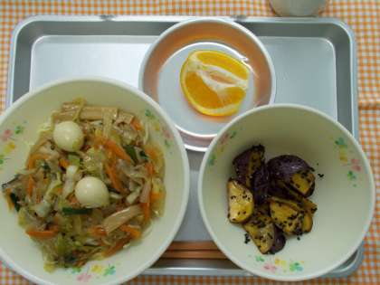 ♪焼きそばあんかけ 大学いも くだもの(いよかん) 牛乳♪