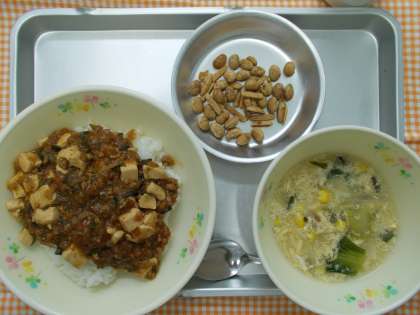 ♪マーボーどん たまごとコーンの中華スープ 豆ナッツ黒糖 牛乳♪