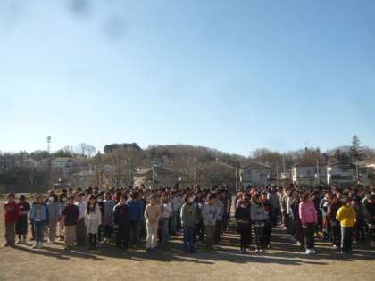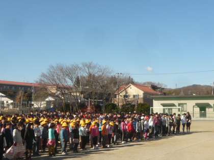 午前8時35分、校庭に子供たちが並びます。