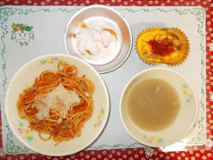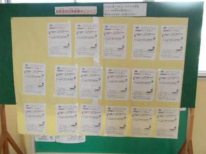 今日の6年生の元気応援メニューは、「八王子ナポリタン・みかんのヨーグルトがけ」です。八王子ナポリタンは、野菜がたくさん入っていて栄養があるところ・みかんのヨーグルトがけは、骨を強くしてくれるなどです。6年生のメッセージは、食育メモで各クラスへ配布するほかにお昼の放送で伝え、1年生の昇降口にも掲示しています。