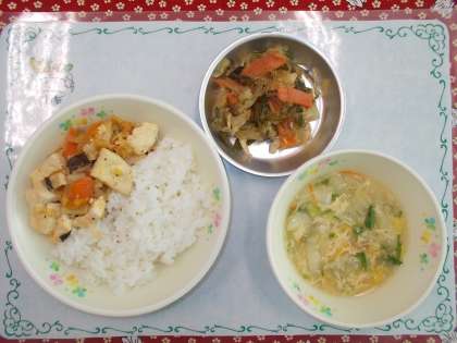 今日は、韓国風料理です。チゲ豆腐とチャプチェは児童に向けに辛さを控えました。白菜・人参・青梗菜・大根・葱・玉ねぎとたっぷり野菜を使ったメニューです。