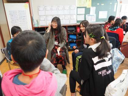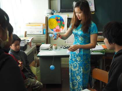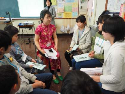 午前中の3時間を使って、1組から3組までの教室で、それぞれ、小グループに分かれた自己紹介や中国や日本についてのディスカッションをしました。「中国の有名な食べ物は?」「一番有名な観光名所は?」などの質問だけでなく、「日本の好きなところは?」「日本に来て、一番困ったことは?」「日本人のいいところは?」など、日本の印象などを聞く質問も多く聞かれました。子供たちも事前に準備してきた日本の紹介をしました。日本で昔から伝わる遊びや、日本で一番有名なところ、日本のアニメの紹介など実演なども交えながら紹介する姿が見られました。