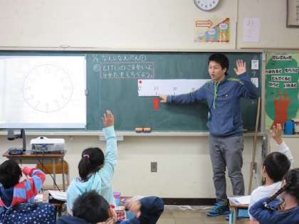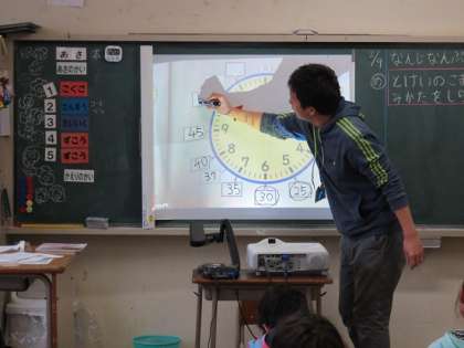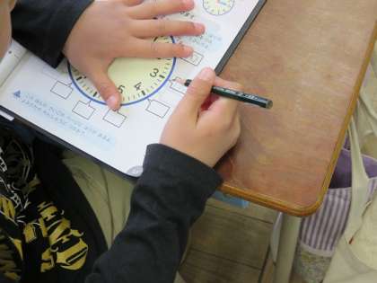 2月9日(木)時計の学習では、子どもたちが理解がしやすく、自分の考えがより深められるように工夫しています。市内の全小学校の全教室に設置された「書画カメラ」を効果的に活用し、スクリーンに映し出された大きな時計に時刻を書き込んだりしました。子どもたちは、視覚的な手がかりをヒントに、自分の教科書に書き込むことができていました。また、以前に習った週直線を思い出して、『5とび』の数え方をするとすぐに時刻が分かることに気がついていました。