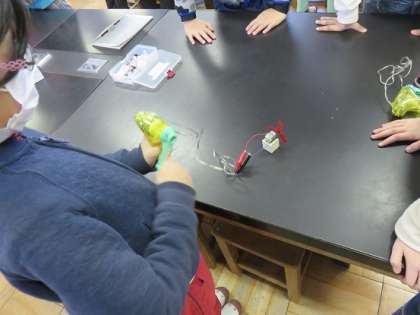 2月10日(金)6年生は、『発電と電気の利用』という学習で、手回し発電機の働きを実験して、調べていました。手回し発電機から作り出される電気が視覚的・聴覚的に分かるように、子どもたちは、プロペラの付いたモーターにつなげたりして、班ごとに実験していました。発電機だから、電気が作れて、モーターが動いて、プロペラが回ると予想を立てていましたが、実際にプロペラが回ると、「回った!」「やった!」などと声を上げていました。