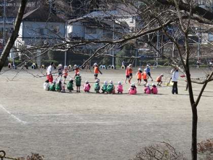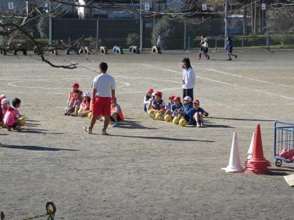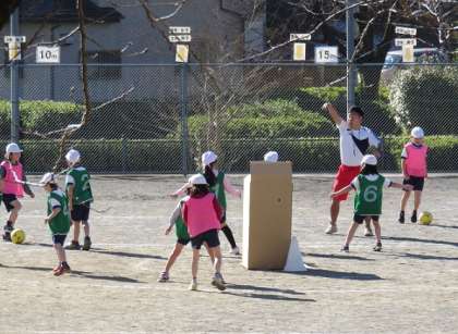 2月10日(金)今日の2年生の校庭での体育の学習には、5年生の担任の島田先生が加わって、子どもたちと楽しく勉強していました。本校の職員室では、子どもたちが帰った後に、学年の先生方同士などいろいろな場面で教員同士の教材研究が盛んに行われています。2年生の体育の『ボールけりゲーム』の題材についても、学年の担任同士の教え合いに加え、体育主任の島田教諭が、いろいろなアイディアを提供しています。そして、5年生の学級の子どもたちが専科の先生の授業の合間を使って、2年生の体育の授業に参加しました。ボールに慣れる運動、そして、2つのチームに分かれて、段ボールを、蹴ったボールで倒すゲームをしました。2年生の子どもたちは、楽しく運動をしていました。このように、校内の教員が互いのよさと強みを活かし合った授業づくりを進めています。