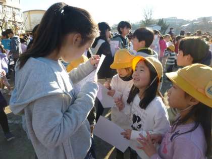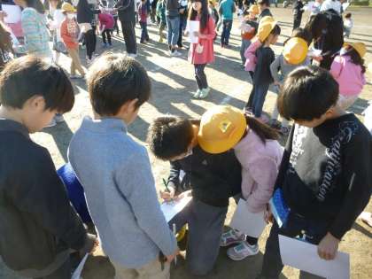今日の児童集会は「サイン集会」です。6年生は卒業までに、あと28日。他の学年の子供たちも、今のクラスのお友達と一緒に過ごすことができるのも、あとわずかとなりました。今日は、全校児童が校庭に集合し、いろいろな学年のお友達にサインをしてもらいます。黄色い帽子をかぶった1年生が、6年生のお兄さん、お姉さんのもとに駆け寄り、「サインしてください」と恥ずかしそうに紙を差し出す微笑ましい光景があちこちで見られました。また、普段、あまりおしゃべりしたことのない友達や、ほかの学年の子供たちに積極的にサインをもらいに行く姿も見られました。終わっ他後、画用紙いっぱいに書かれたサインを見せ合いながら嬉しそうに教室に帰っていきました。
