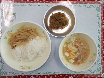 今日は、和食で使う牛蒡をハンバーグのソースしました。ハンバーグは、脂を抑えてタンパク質をしっかり摂るために豆腐を使ました。きんぴらは、牛蒡を使わず、千切りにしたじゃがいもで作りました。さっと湯通ししてから炒めることで、シャキシャキとした食感が味わえます。