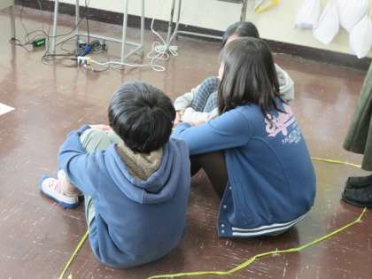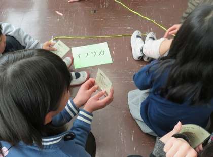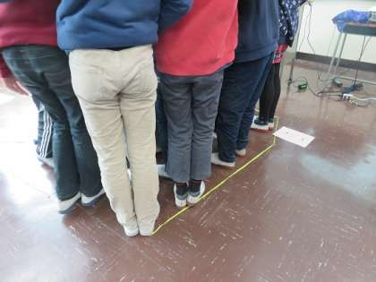 2月15日(水)子どもたちは『役割カード』に書かれた大陸の名前にしたがって、教室の床に区切られた枠の中に移動しました。比較的ゆったりとスペースのある大陸、座ることもできず人がひしめきあっている大陸と、50年後の世界の人口の推移と地域での差の大きさに驚いていました。