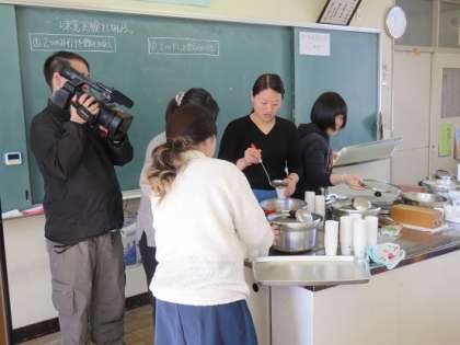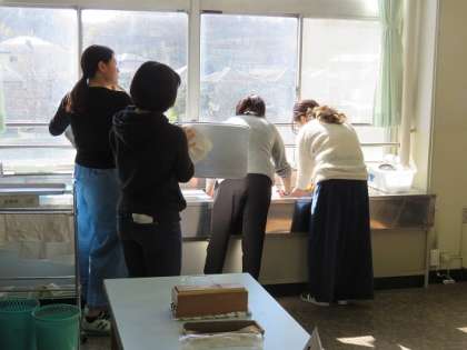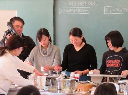 2月17日(金)実習の場所づくりのほかに、配布用のお盆を始めいろいろな道具類の準備もしていました。また、授業の進み具合にあわせて、子どもたちの試飲するだしのカップを一人4種類ずつを小分けに分ける作業もしてもらいました。