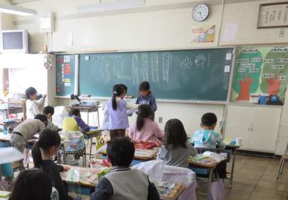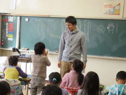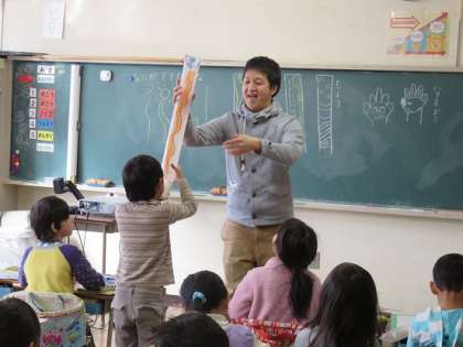 2月21日(火)「先生、見ていて。ぼく、膨らませるよ!」作品が出来上がった子どもたちは、先生に見てほしくって、先生の周りに集まっていました。息をいっぱい吸い込んで、プーと吹き込むと、みるみるビニール風船は伸びていました。