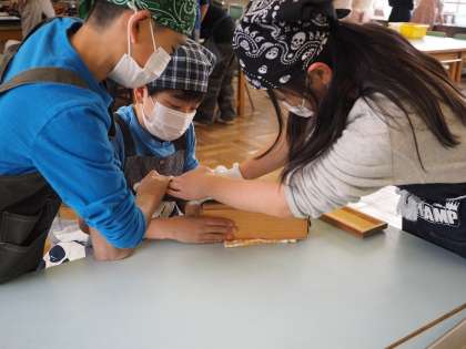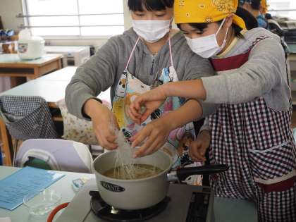 今日は調理実習の内容はご飯とみそ汁です。ご飯は米の洗い方や水の分量を量る作業を実習の中心に、みそ汁はかつお節を削り、みそ汁の実の取り合わせを自分たちで考えました。一度経験しているとはいえ、かつお節を削る体験はコツがいります。苦戦しながらかつお節を削り、その鰹節でだしを取ってみそ汁を作ります。自分で削ったかつおだしはおいしかったようです。