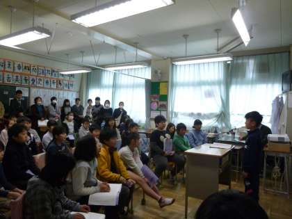4年生が3学期に総合で取り組んできた「10歳の宣言」のまとめとして、発表会が行われました。まず自ら将来への課題を設定し、設定した課題に関する情報を本、インターネット、電話、インタビュー等で収集しました。国語「わたしの研究レポート」と合科で授業を進め、子供たち同士でお互いに文章を推敲し合い、より良いものに仕上げていきました。そして、来てくださる保護者の方へ想いが伝わるように最後まで練習して迎えた当日。各クラスで子供たちが、堂々と「10歳の宣言」を行いました。『先生になりたい』『美容師になって、その人に似あう素敵な髪形にしたい』『サッカー選手になって世界で活躍した』子供たちの夢は大きく広がっています。そして、その職業に就くために、日々の努力が必要だということも、調べ学習を通して学ぶことができました。
