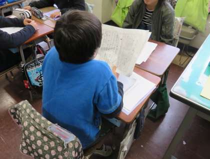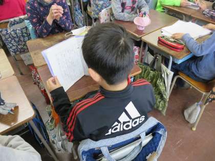 3月2日(木)クラスの友だとやたくさんのお家の方の前で発表することに、子どもたちはドキドキしていました。二人向かい合って、お互いの発表を聞き合い、アドバイスをし合いました。「自分が伝えたいことが、力強く相手に伝えられるように、冒頭とまとめの部分は、台本を見ないで、しっかり覚えて言おう。」「早口になると、聞いている人が分かりにくいよ。」などと相手の人がよい発表ができるようにアドバイスをしていました。そして、一度だけし合うのではなく、一人の人が終わるともう一人の子が間を開けることなく、発表練習するなど、子どもたちは真剣に練習を繰り返していました。本番の発表会での子どもたちの達成感に結びついたと考えています。