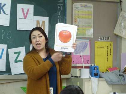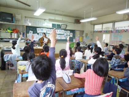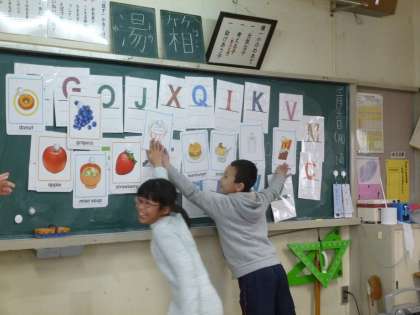 今日も遠藤先生が3年生に英語を教えてくださいました。ローマ字を学習した3年生ですが、「ローマ字と英語の違いって?」というところから、アルファベットのカードを使って、ローマ字にある文字とない文字の確認をしました。日本語にはない発音の仕方も、口や舌の使い方を教えてもらい、みんなで発音してみます。