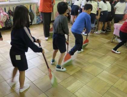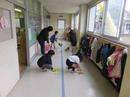 3月6日(月)ほうきを使った掃き掃除でも、子どもたちは、一列に並んではき残しのごみがでないように気をつけながら掃除をしていました。教室や廊下のい掃除でも、担任の先生やサポーターの先生と一緒に、そして、見てもらいながら一所懸命掃除をしていました。