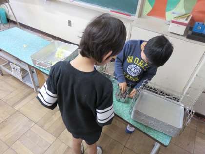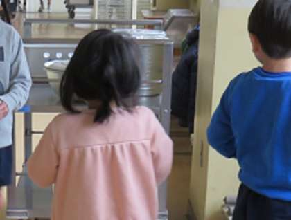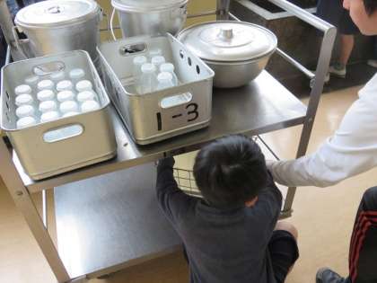 3月6日(月)給食が終わって、給食当番の子どもたちは、配膳台をきれいに台フキンで拭き掃除をしてくれていました。そして、ワゴン車まで、食器を片づけていました。じょうずにワゴン車に食器かごが入りように、先生に手伝ってもらっていました。