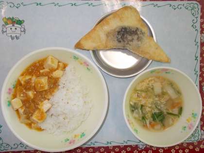 今日は、児童に人気の麻婆豆腐です。低学年は辛さを抑えて作ってあります。小豆春巻きは、給食室で作った小豆餡に胡桃・胡麻・ごま油を入れてしっとり感を出しました。小豆の苦手な児童でも食べやすいと思います。