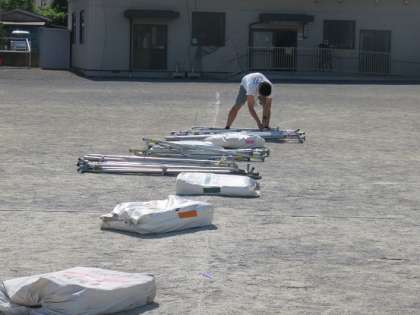 テントの部材としてのテントを覆う『テント布』を13個、運び出していました。テントとそれに対になっている『テント布』が間違わないように区別して、まとめていました。