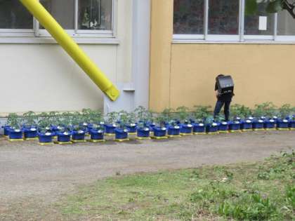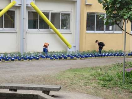 登校班で登校した2年生が、南校舎の昇降口に向かう途中に、何人もの子どもたちが中庭の鉢の所にやってきます。