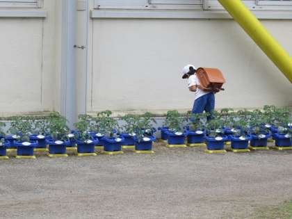 などと、子どもたち一人ひとりが、先日鉢植えした、自分のミニトマトの苗を覗き込んでいました。また、ペットボトル型のジョーロで水やりもしていました。