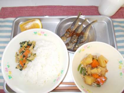 豆あじのなんばん漬けは、豆あじをカラッと揚げ、なんばん漬けの味付けをしたので、魚の苦手な人も食べやすかったようでした。