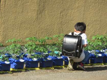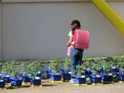 ランドセルを背負ったまま、自分のミニトマトを子どもたちは、じっと眺めています。