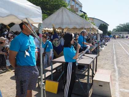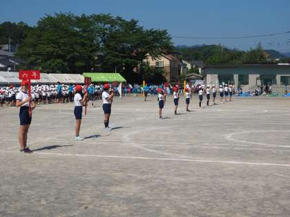 澄み切った青空の下、創立120周年記念運動会が始まりました。プラカードを持つ係の子を先頭に、子どもたちは、毎週の児童朝会の時に練習している行進の学びを活かして、堂々とした姿で入場できていました。