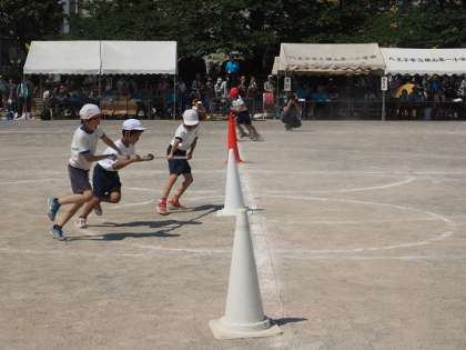 3年生も4人一組になって、棒を持ってコーンを回ってリレーをします。昔から行われいる運動会の定番の種目の一つです。コーンを回るときの仕方の上手下手が勝敗の鍵を握っているようです。コーンに一番近い子が、自分の身体をできるだけコーンのそばに寄せ、遠心力に負けないように、棒をコーンから離れないように引っ張ると小さく、スピードを落とさずに回れます。先生から教えてもらったのを活かして、上手にコーンを回っているチームがたくさん見られました。