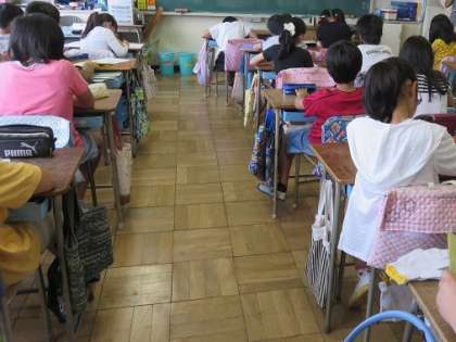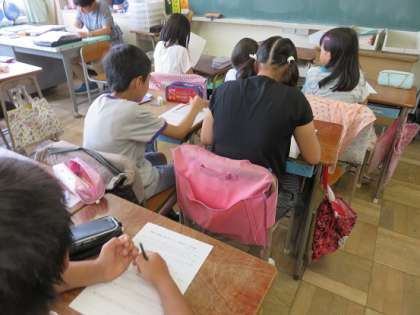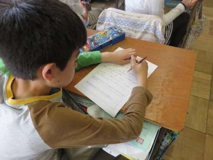 5年生のほかのクラスでも同じように、「組体操振り返りシート」をしていました。この「組体操振り返りシート」は、通常の学級の5年生・6年生全員に加え、交流学習で一緒に組体操をしたすみれ学級の5・6年生にも同じシートに取り組んでもらいます。