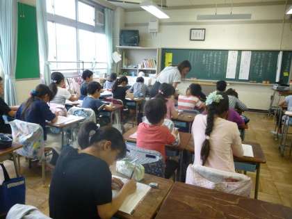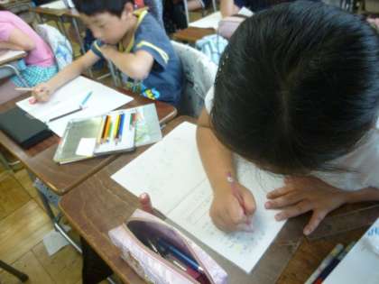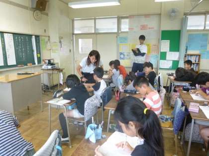 4年生の国語で俳句つくりをしていました。前の時間に「春」から想像できる言葉を集め、ノートにまとめました。そして今日は、いくつかの例題をもとに、自分たちで「五・七・五」で俳句を作りました。「早く作りたい!」と意欲満々の子どもたち。どんどんノートに書き留めていきます。初めは言葉をただつなげて「五・七・五」の言葉数だけで作っていた子供も、先生からのちょっとしたアドバイスでキラッと光る俳句に大変身。すてきな作品ができました。