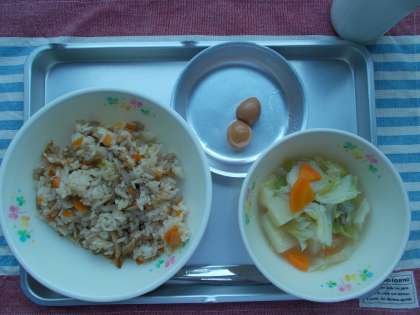 本日は、とりごぼうピラフを食べてもらいました。給食では、40kgのお米を8釜に分けて炊きます。ごはんがよく混ざるように、味付けをした具材とごはんを一緒に炊き上げました。味がよくしみ込み、混ぜる際のムラが少なくなります。給食をおいしく食べてもらえるよう、これからも取り組んでいきます。