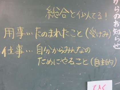 この児童集会の始めに、校長先生のあいさつの中で『用事』と『仕事』の話がありました。そのお話を、4年生のある教室では、朝の会に担任の先生が改めて子どもたちに話され、一年後に委員会活動に加わる4年生の自覚と意識を高めさせていました。