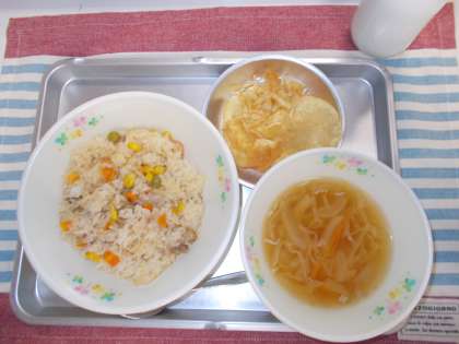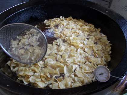 野菜チップスは、ジャガイモとごぼうをスライスして、素揚げしました。子どもたちからの人気のメニューの一つです。