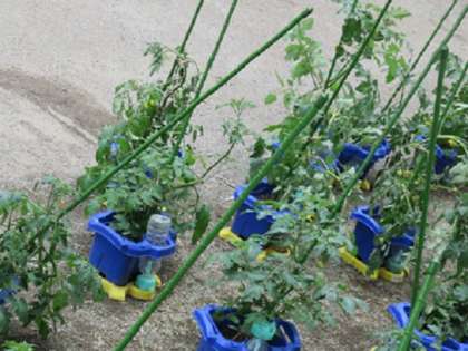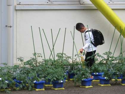 子どもたちは、先生と一緒に、ミニトマトの支柱立てをしました。いろいろなお世話をしながら、ミニトマトが子どもたちの身近な存在になるようにしています。