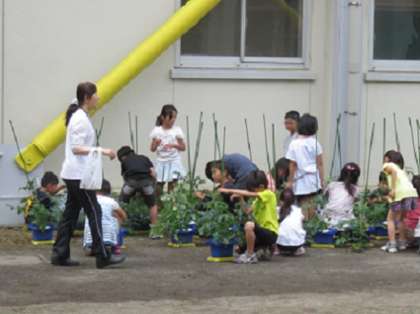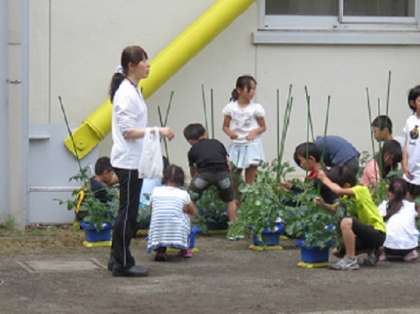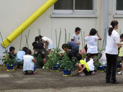 先日、子どもたちが植えたミニトマトのお世話をしていました。支柱にミニトマトの茎がちょうどよく止まっているかなど確かめたりしていました。そして、お世話をしながら観察もしていました。